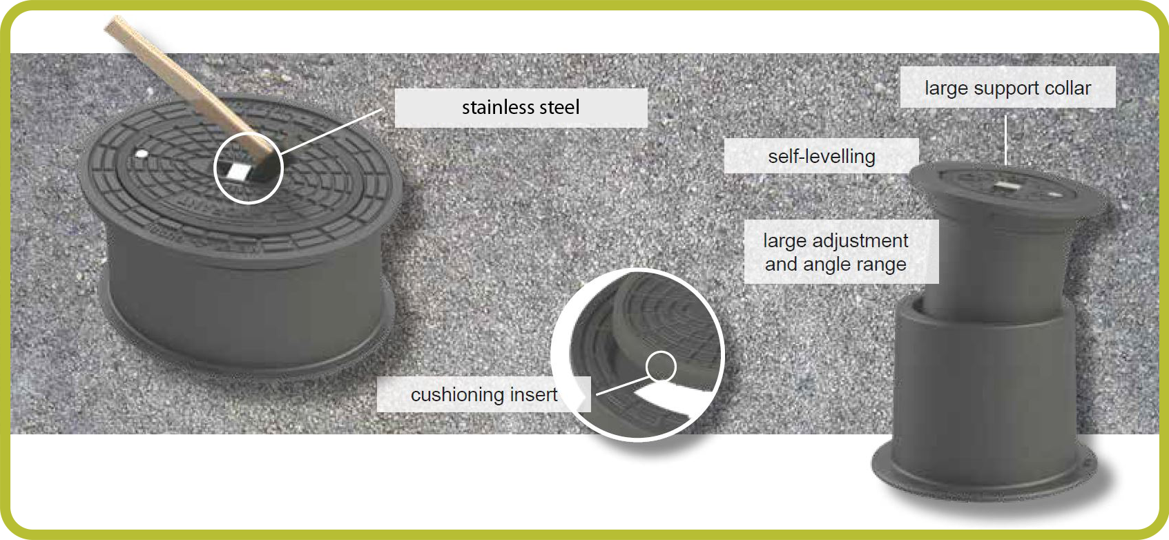 - cover with integrated (exchangable) cushioning insert MEIPREN®, tested for installation in hot asphalt surface (1 hour / 180 °C)